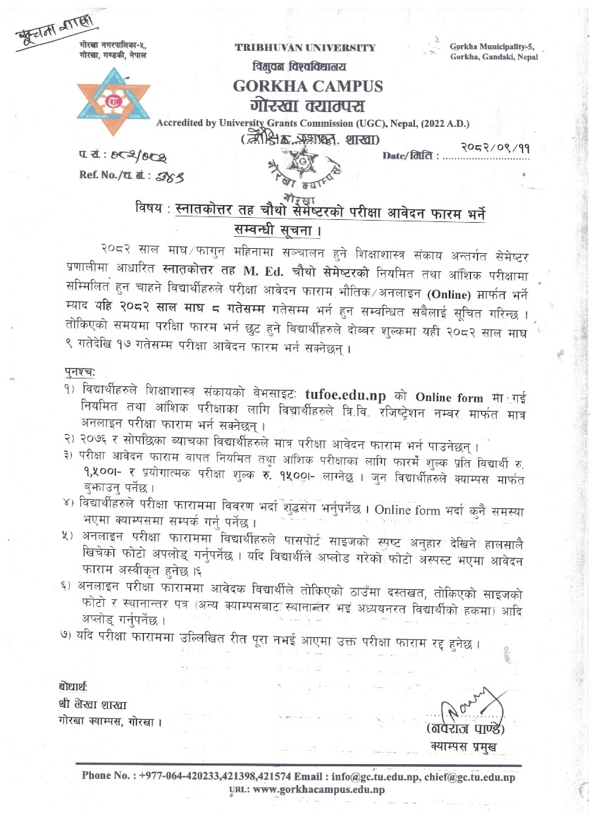 Notice regarding filling up the exam form for M.Ed. 4th Semester 2082
