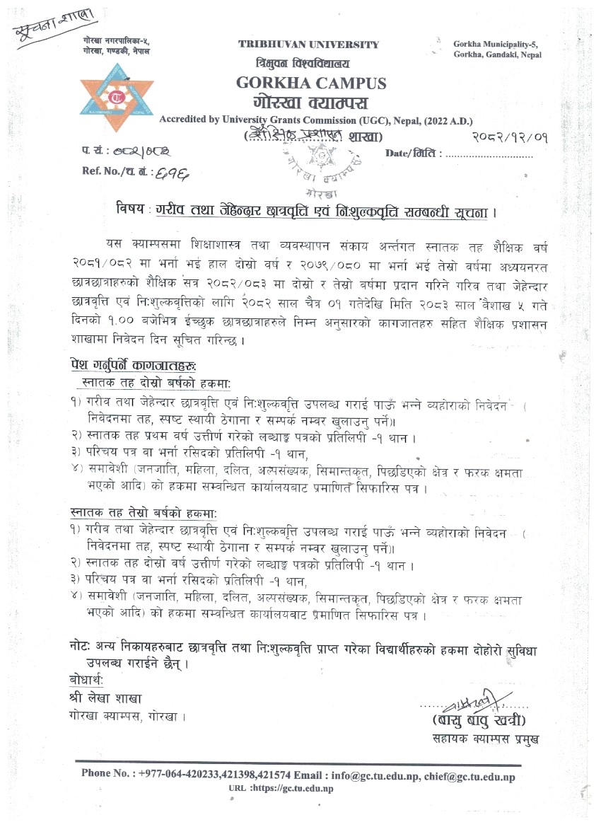 गरिव तथा जेहेन्दार छात्रवृत्ति एव निःशुल्कवृत्ति सम्वन्धी सूचना ।