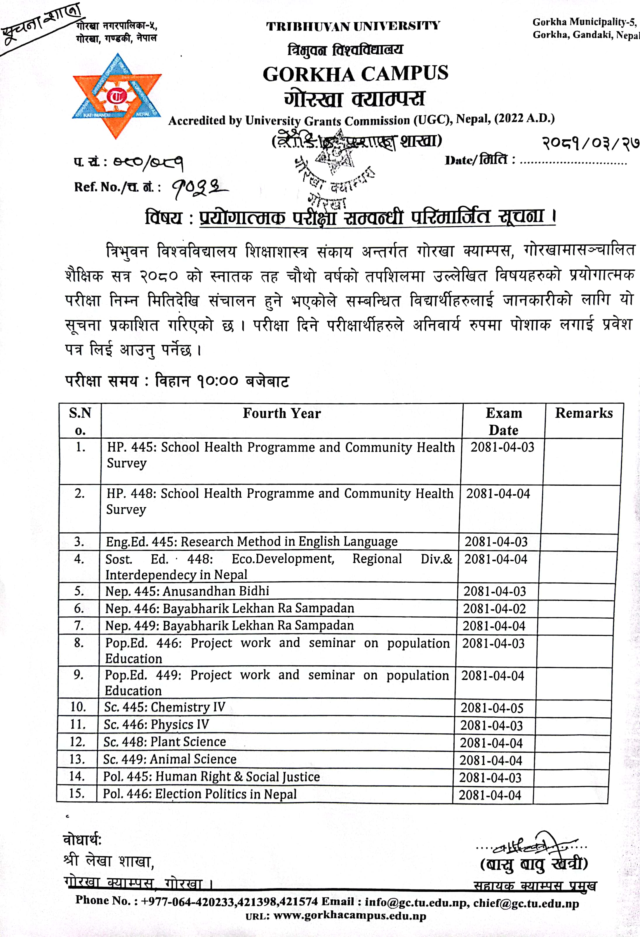स्नातक तह चौथो वार्षको प्रयोगात्मक परीक्षा सम्बन्धी परिर्माजित सुचना