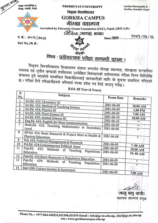 Exam Schedule: 4-Years B.A., B.B.S, B.Sc., B.Ed., BFA Third-Year Regular/Partial 2082
