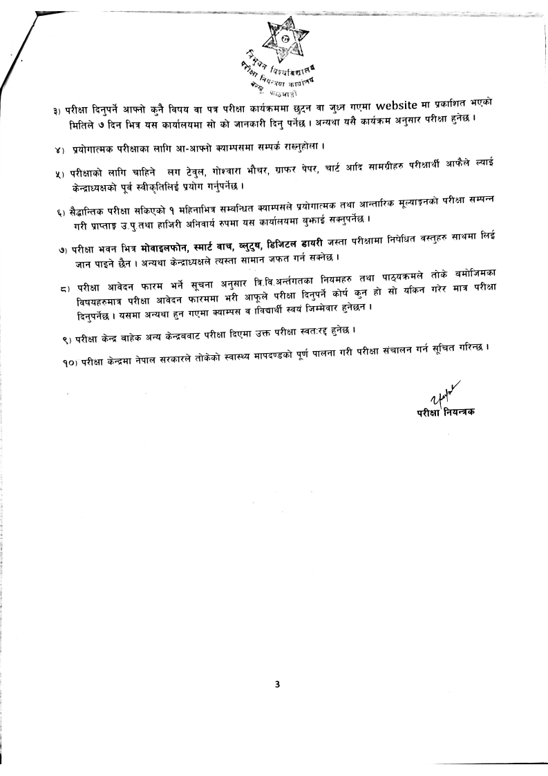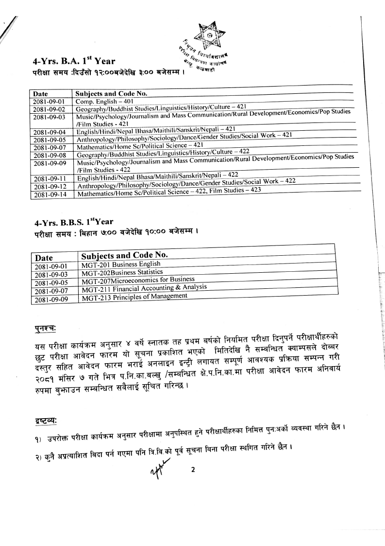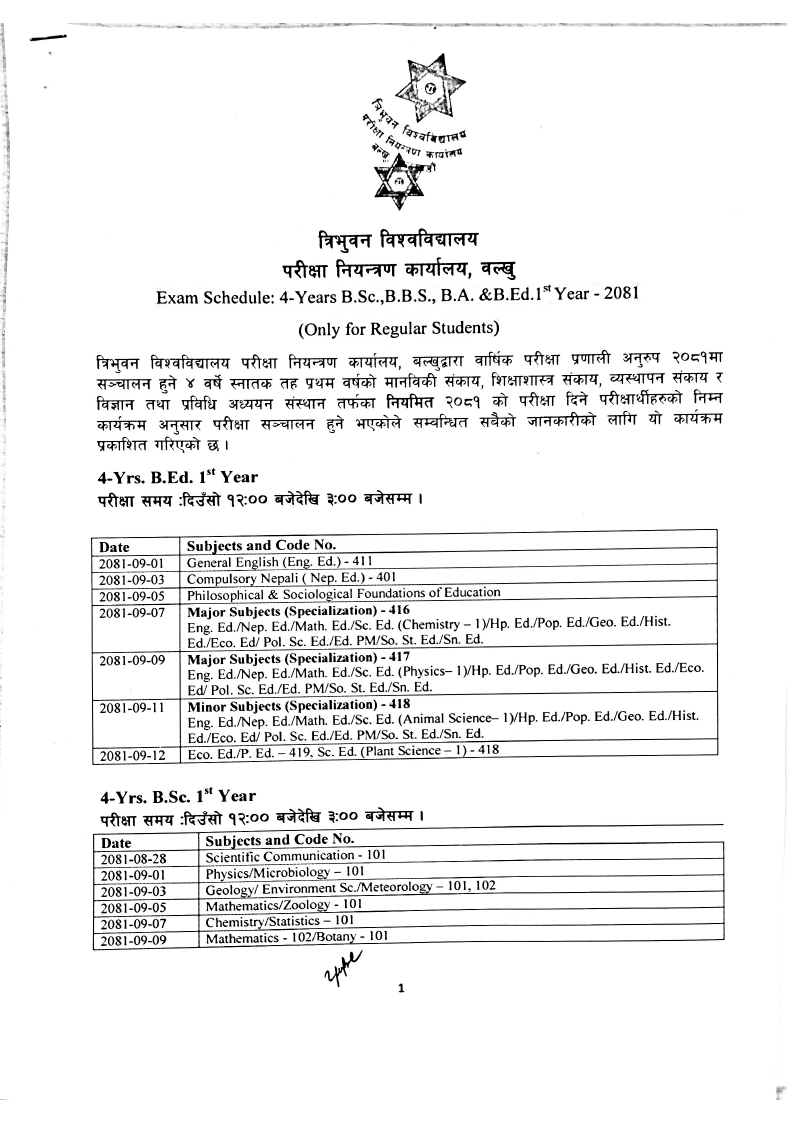 Exam Schedule : 4 Years B.Sc. B.B.S,B.A. & B.Ed. 1st Year -2081