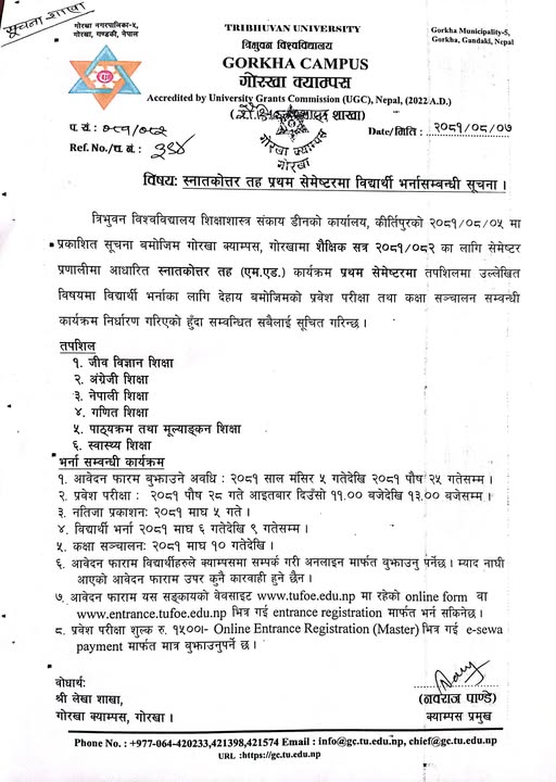स्नातकोत्तर तह प्रथम सेमेष्टरमा विद्यार्थाी भर्ना सम्वन्धी सूचना ।