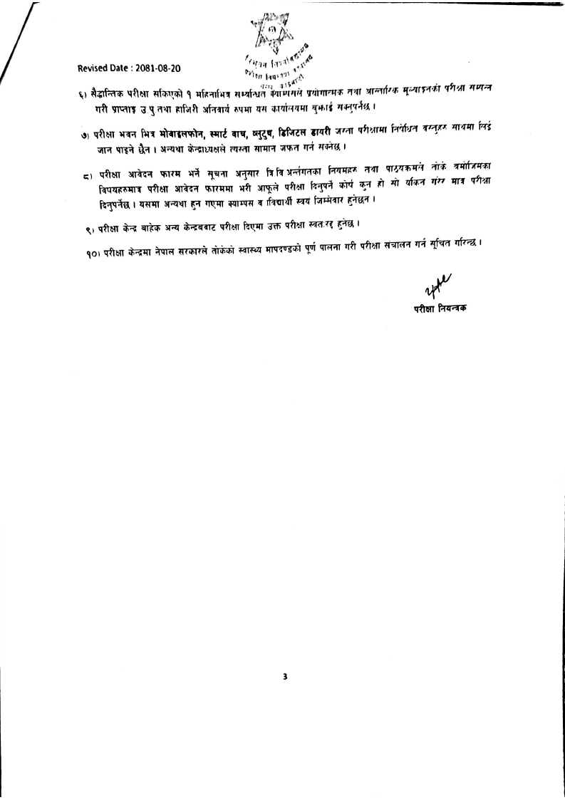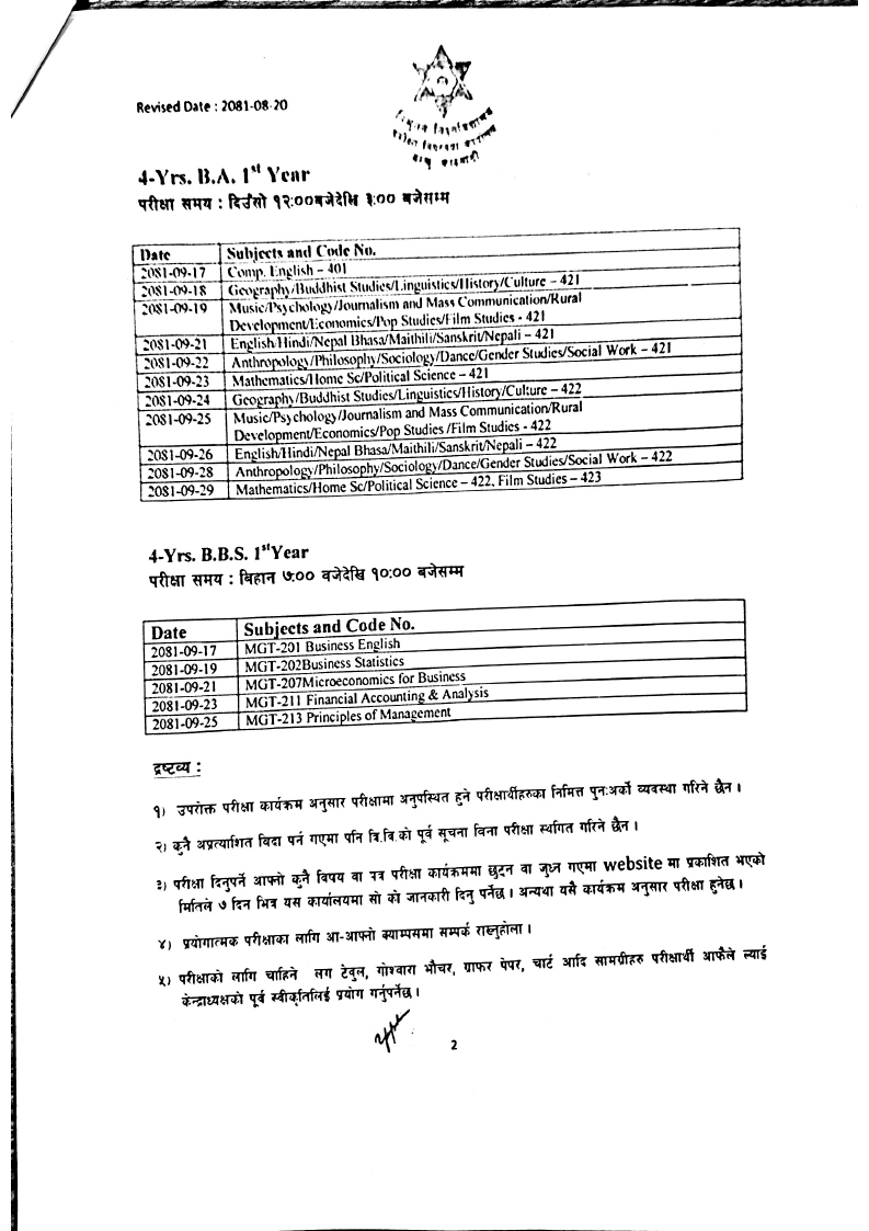Exam Schedule : 4 Years B.Sc. B.B.S.,B.A. & B.Ed 4th Year 2081 (Only For Regular Students) Revised: 2081-08-20