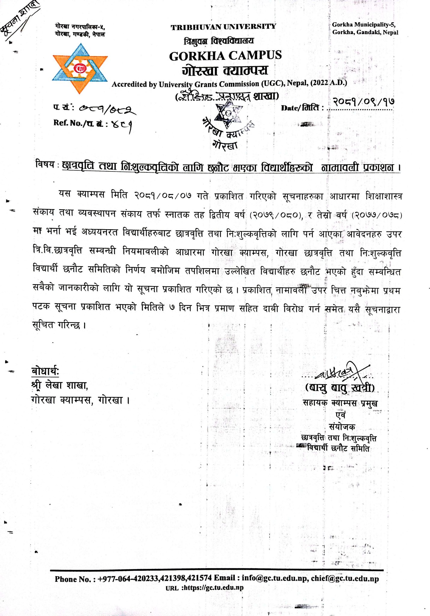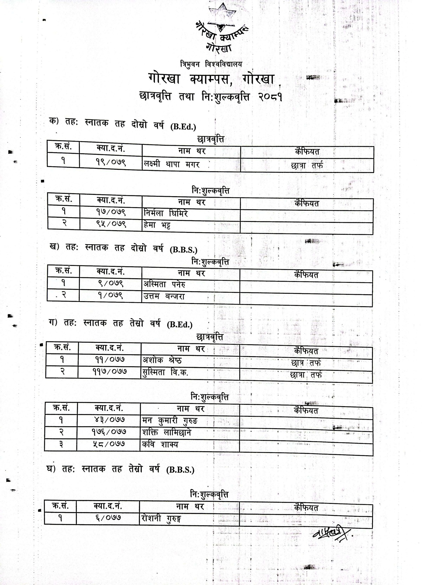 छात्रवृत्ति तथा निःशुल्कवृत्तिकाे लागि छनाैट भएका विधार्थीहरूकाे नामावली प्रकाशन