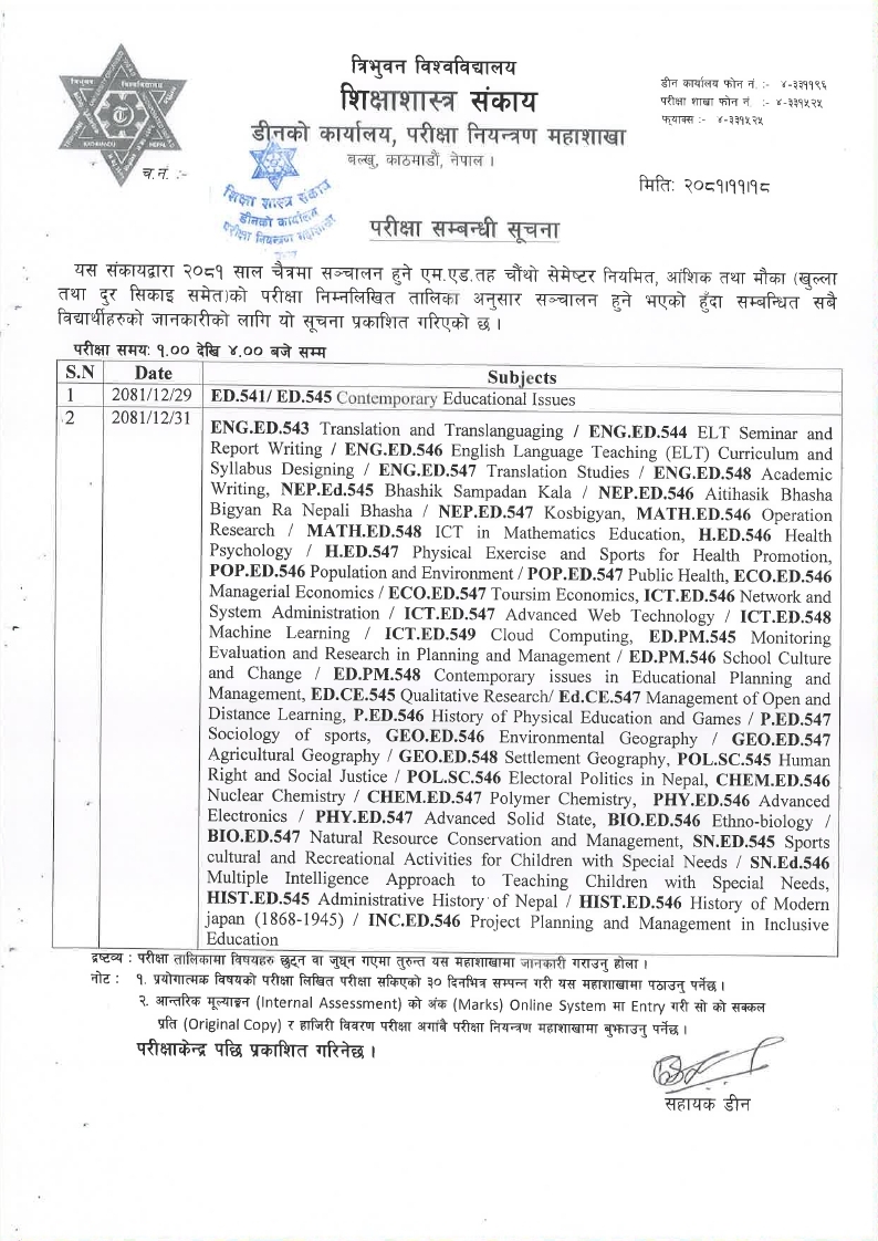 M.Ed. 4th Semester Examination Routine 2081