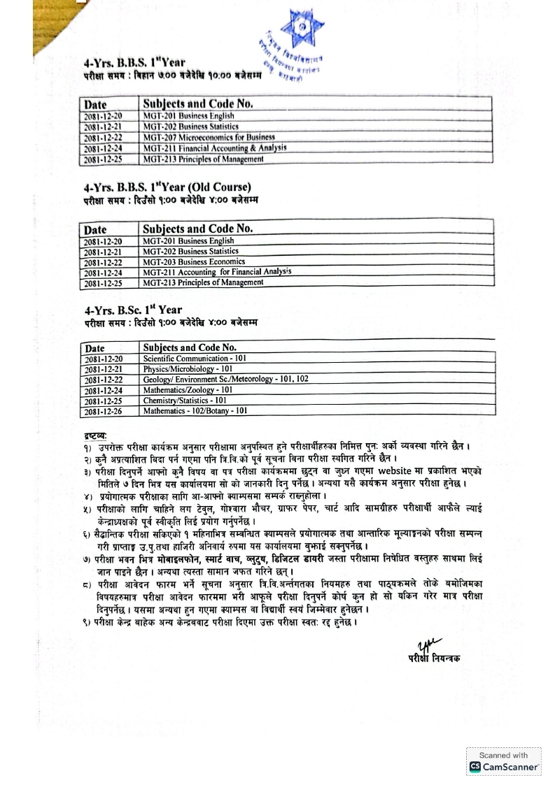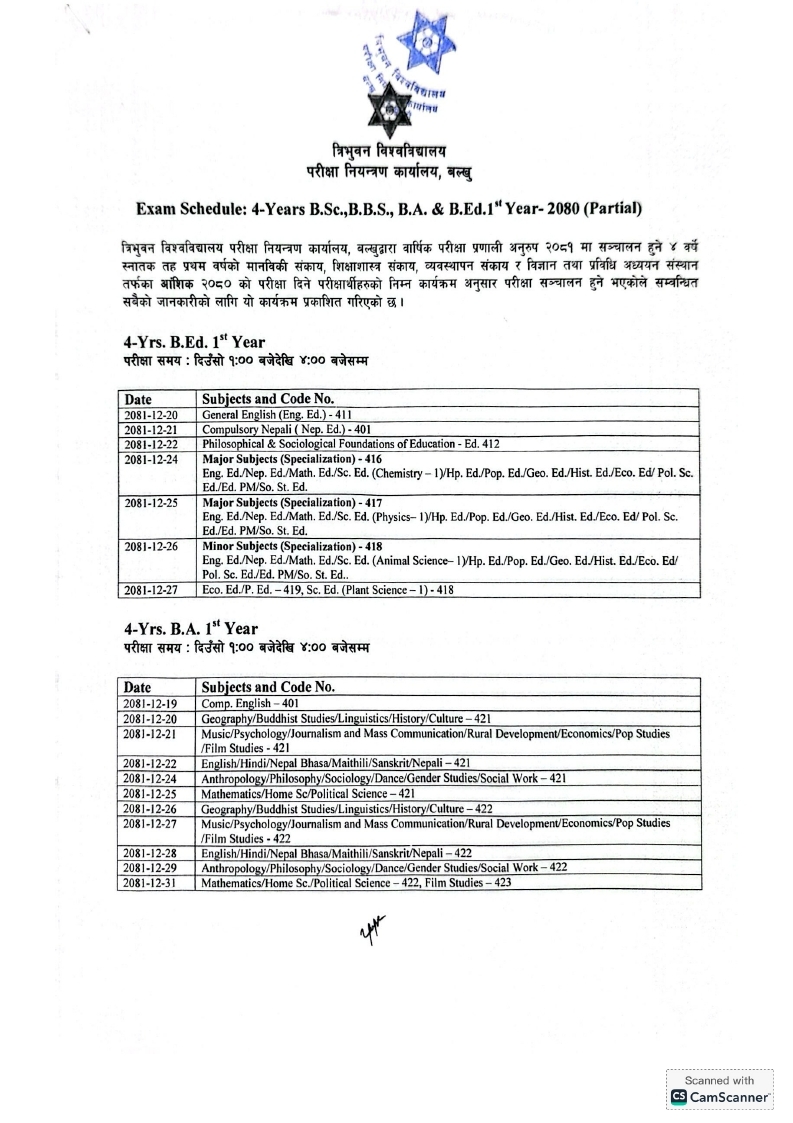 Exam Schedule : 4-Years B.Sc.,B.B.S,B.A. & B.Ed. 1st Year - 2080 (Partial)