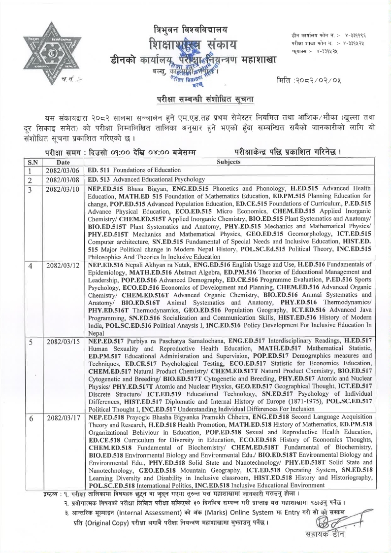 Revised Examination Schedule for the M.Ed. 1st Semester 2082