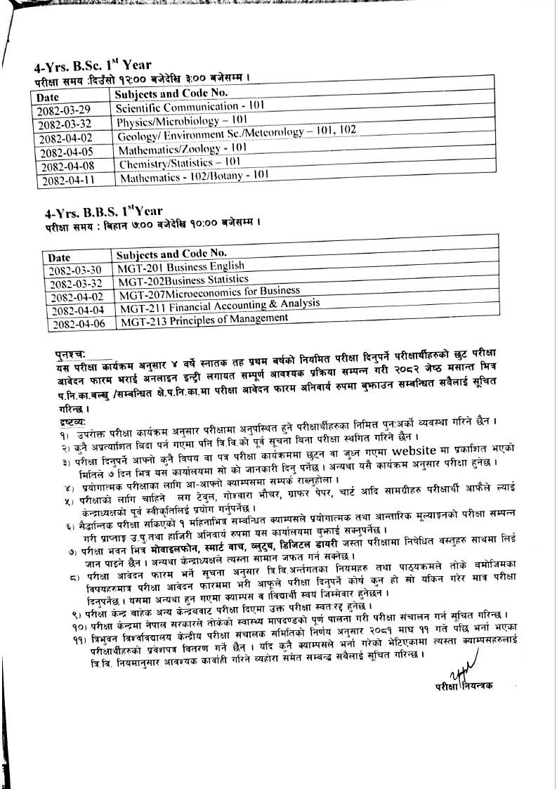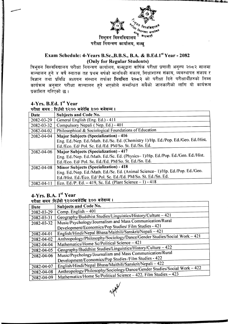 Exam Schedule: 4 Years B.Sc., B.B.S.,B.A. & B.Ed. 1st Year - 2082(Only for Regular Students)
