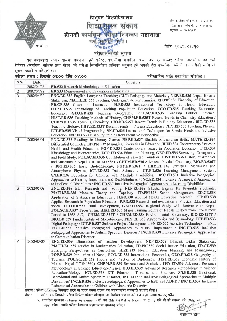 Examination Schedule for the M.Ed. 3rd Semester 2082