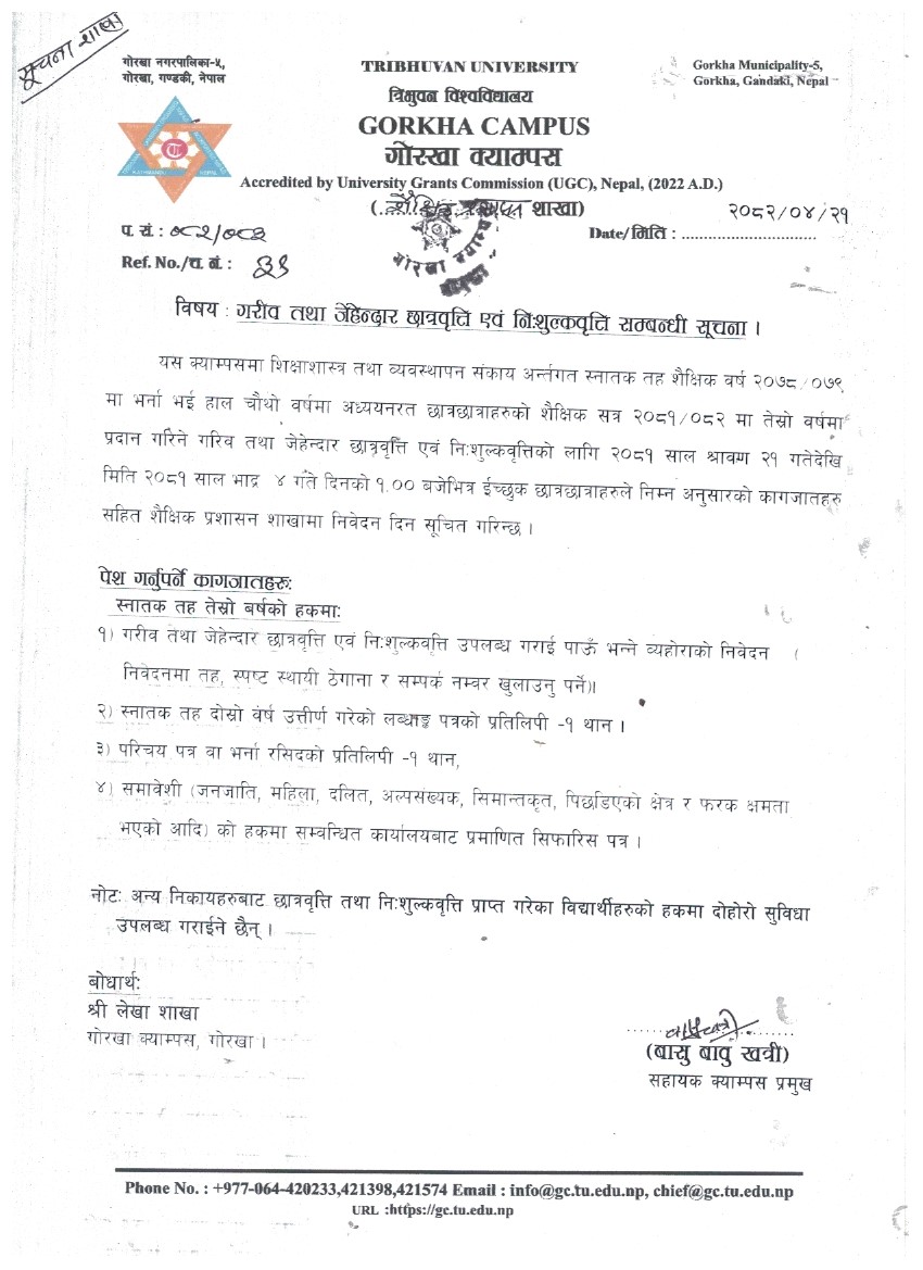 गरिव तथा जेहेन्दार छात्रवृत्ति एव निःशुल्कवृत्ति सम्वन्धी सूचना ।