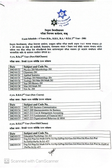Exam Schedule : 4 Years B.Sc., B.B.S.,B.A., and B.Ed. 2nd Year - 2081